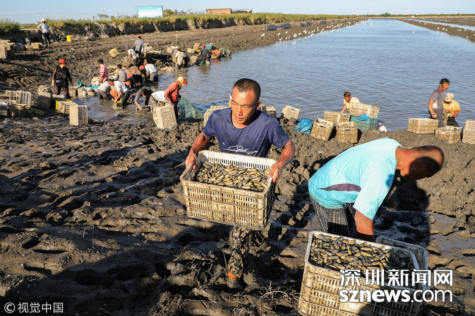 深圳新聞網訊 2018年9月8日,遼寧丹東,早上5點,挖蟶人紛紛下到各個池子,要在海水海泥里艱辛勞作10小時,直至下午3點集體上岸,等待買家的運輸車隊運走他們的勞動成果。9月初,遼寧沿海養殖區進入養殖海鮮的收獲季。在東港,常常出現數百人乃至上千人集結在池子里挖蟶子(這里特指縊蟶,即東港當地人所說的小人仙。下同)的壯觀景象。在養殖海鮮的收獲季,成群的海鷗趁機“助陣“,人與大自然和諧共處的畫面令人嘆為觀止。