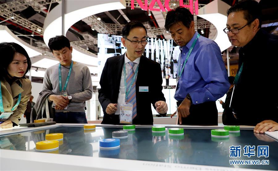 11月5日,一名工作人員在歐姆龍展臺演示與機器人進行乒乓球對戰。新華社記者 方喆 攝