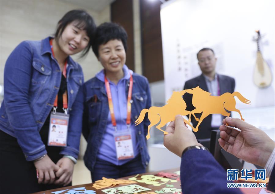 11月4日,在首屆中國國際進口博覽會新聞中心,媒體記者觀看中國傳統剪紙技藝展示。 新華社記者蘭紅光攝