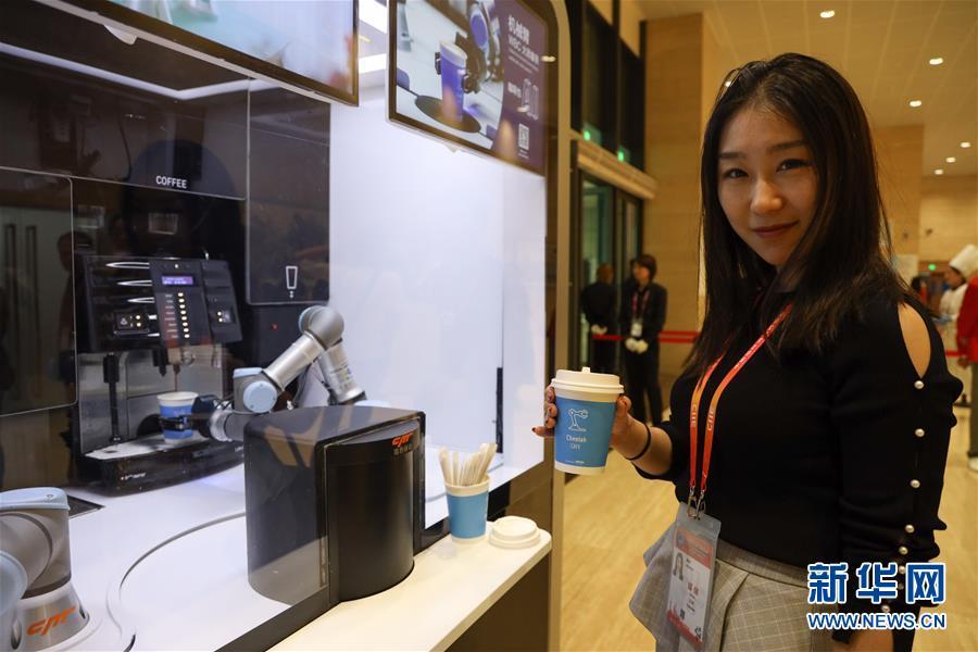 11月4日,一位媒體記者在首屆中國國際進口博覽會新聞中心無人咖啡亭品嘗咖啡。 新華社記者 劉大偉 攝