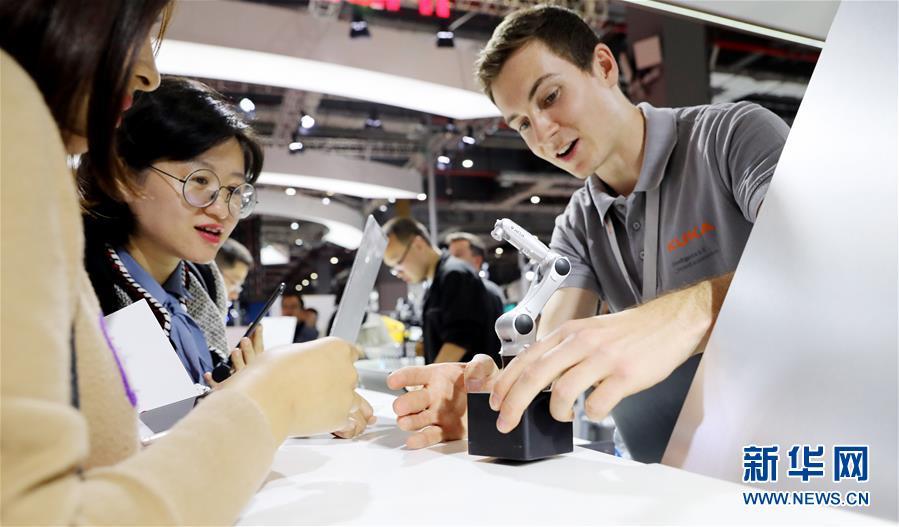 11月5日,庫卡公司工作人員(右)向參觀者展示機器人手臂模型。 新華社記者 方喆 攝