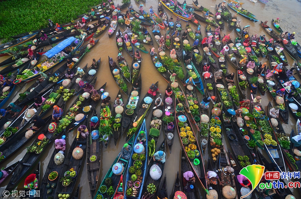 富有煙火氣息的印尼水上集市 商販用獨木舟載貨