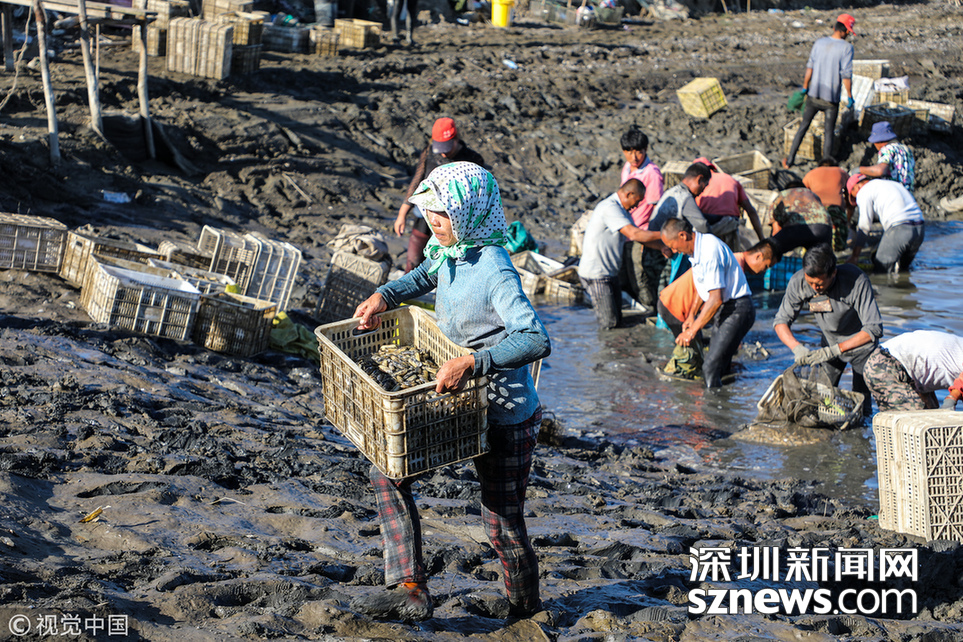 深圳新聞網訊 2018年9月8日,遼寧丹東,早上5點,挖蟶人紛紛下到各個池子,要在海水海泥里艱辛勞作10小時,直至下午3點集體上岸,等待買家的運輸車隊運走他們的勞動成果。9月初,遼寧沿海養殖區進入養殖海鮮的收獲季。在東港,常常出現數百人乃至上千人集結在池子里挖蟶子(這里特指縊蟶,即東港當地人所說的小人仙。下同)的壯觀景象。在養殖海鮮的收獲季,成群的海鷗趁機“助陣“,人與大自然和諧共處的畫面令人嘆為觀止。
