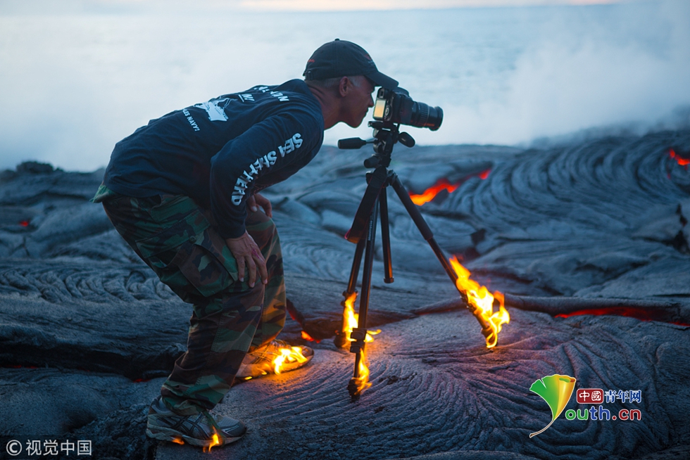 距離巖漿如此之近拍照十分危險。攝影師Kawika Singson在拍攝過程中,經歷了極大的危險。流入海洋的巖漿量,風向,以及巖漿基床的結實程度等風險都需要考慮。 圖片來源:視覺中國