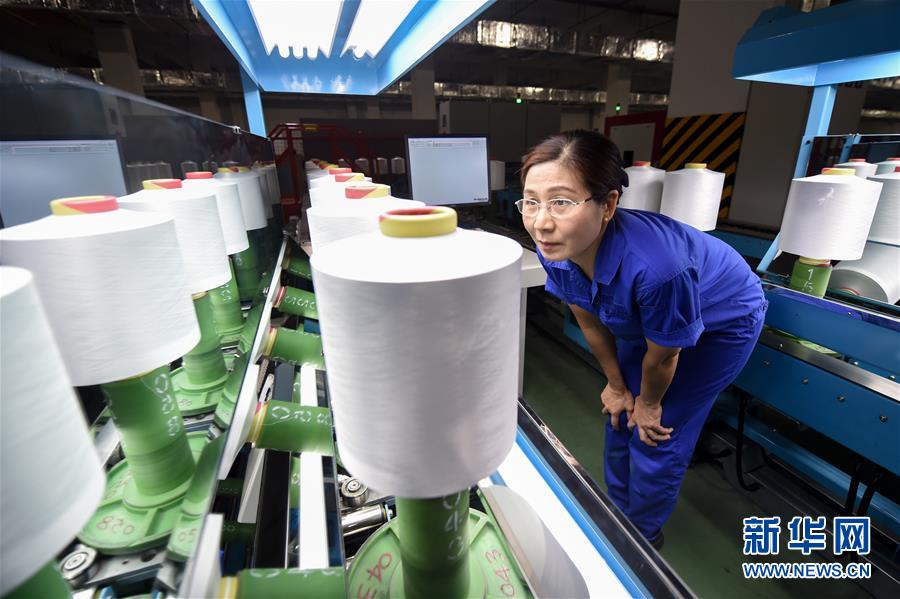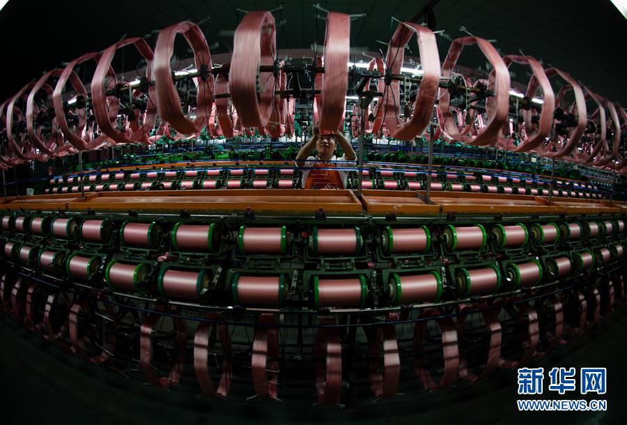蘇州市吳江區(qū)盛澤鎮(zhèn)一家絲綢公司的工人在車間進行絡(luò)絲作業(yè)(2017年5月20日攝)。  新華社記者 李響 攝