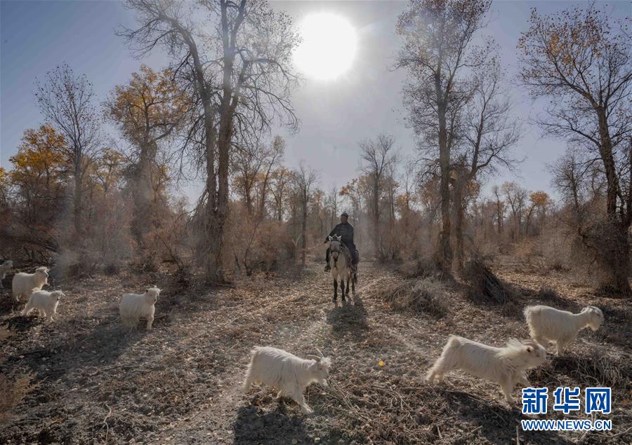 在新疆巴音郭楞蒙古自治州尉犁縣喀爾曲尕鄉的胡楊林里,牧羊人馬木提·買買提在放羊(10月25日攝)。 新華社記者 趙戈 攝