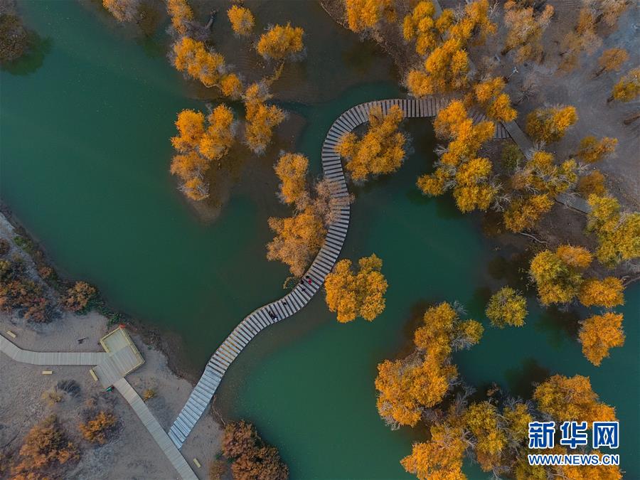 這是在內蒙古自治區額濟納旗拍攝的胡楊林(10月10日無人機拍攝)。 金秋時節,內蒙古自治區額濟納旗胡楊林如同披上金裝,成為大漠中的一抹亮色,吸引眾多中外游客前來觀賞游玩。 新華社記者劉磊攝