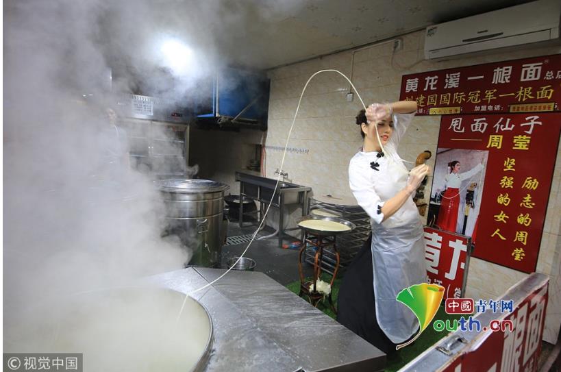 2018年11月19日,成都,繼“妖嬈拉面哥”之后,黃龍溪古鎮一個身材高挑的古裝美女,一邊跳舞一邊揮甩著手中的面條被贊“甩面仙子”走紅網絡。圖片作者:紅葉/視覺中國