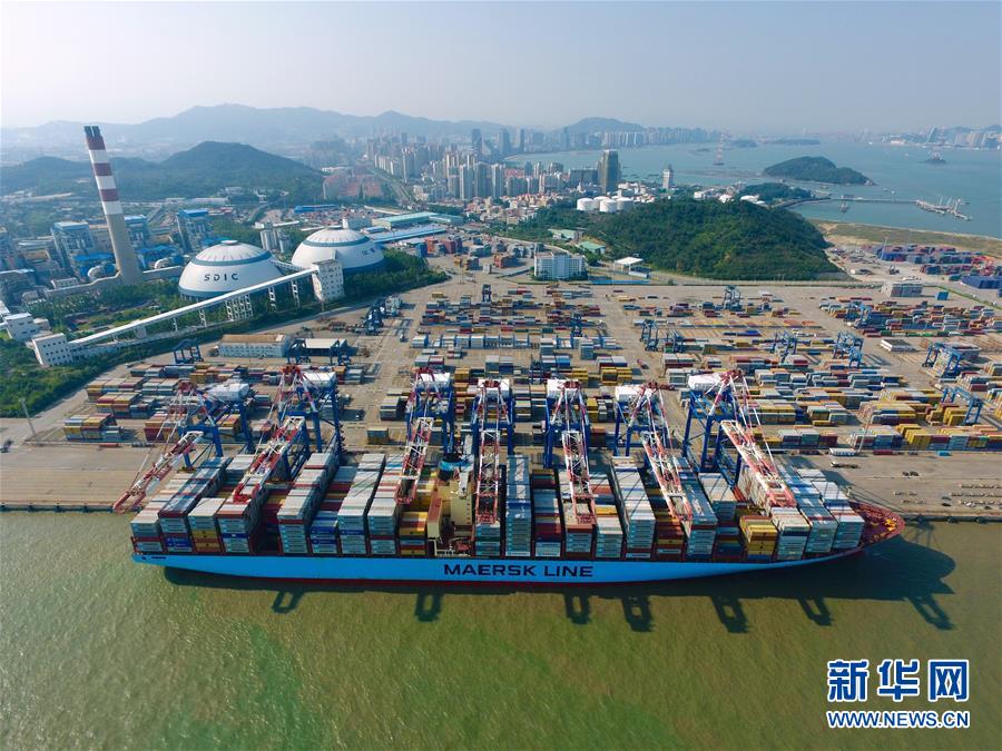 福建自貿區廈門片區海滄嵩嶼碼頭內,一艘國際集裝箱貨輪在卸貨(2017年5月28日無人機拍攝)。 新華社記者姜克紅攝