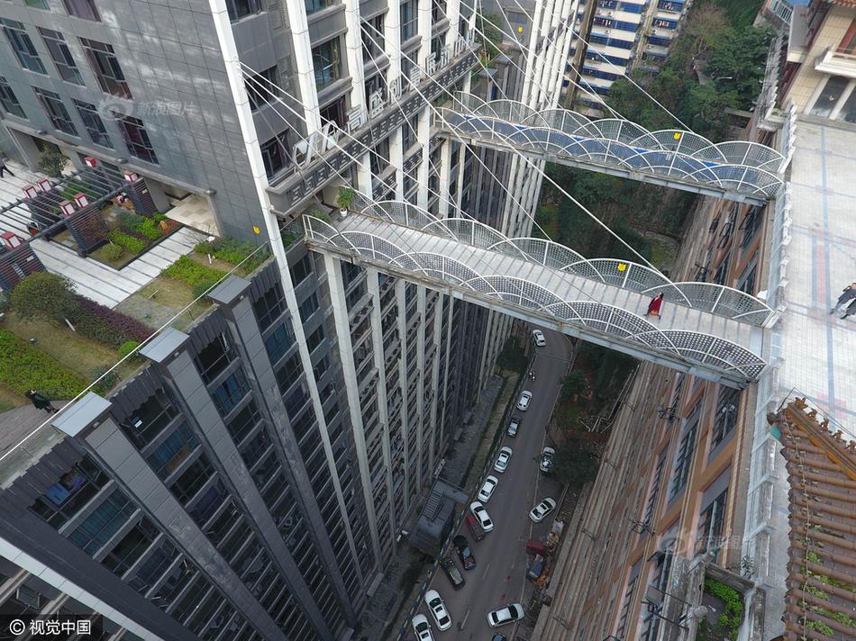 2017年3月16日,重慶,渝中區一棟大樓從22層架起兩座平行的天橋,連接對面的魁星樓廣場地面。圖片來源:視覺中國