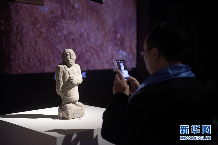 11月21日,觀眾在中國美術館拍攝展出作品“唐石人像”。新華社記者 魯鵬 攝