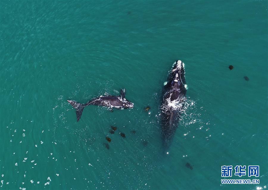 9月30日,在南非赫曼紐斯小鎮(zhèn)附近海面上,2頭南露脊鯨在海岸邊暢游。9月29日,位于開普敦以東約115公里的赫曼紐斯小鎮(zhèn)迎來2018年的鯨魚節(jié),來自世界各地的游客可乘船出海觀鯨,也可在岸邊等待鯨魚的到來。新華社記者陳誠(chéng)攝