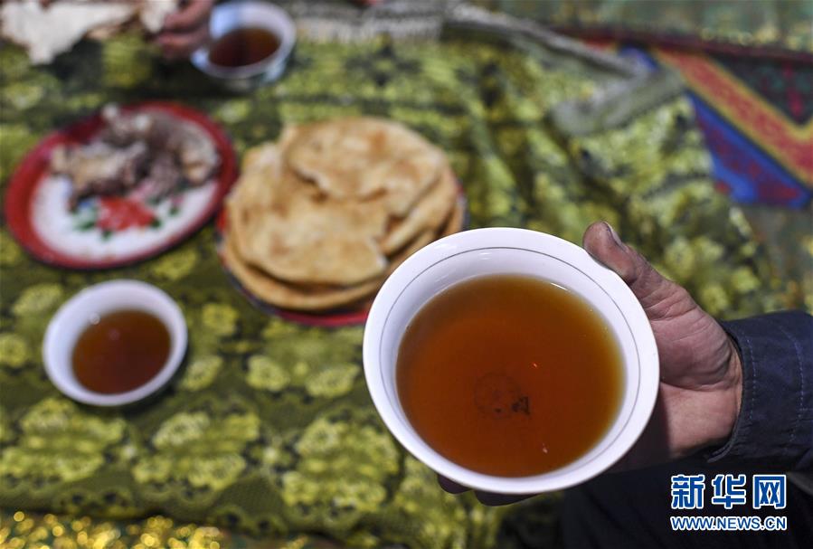 在塔什庫爾干塔吉克自治縣大同鄉阿克托尕欄桿村一組都熱的舊居中,都熱·加爾曼在吃早餐,準備踏上搬遷之路(11月17日攝)。新華社記者胡虎虎攝