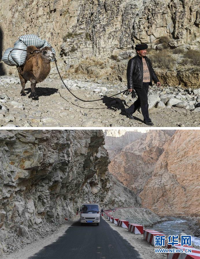 拼版照片:上圖為都熱·加爾曼牽著馱有行李的駱駝走在通往阿克托尕欄桿村村委會的路上;下圖為都熱·加爾曼乘坐汽車從大同鄉前往塔提庫力易地扶貧搬遷安置點(11月17日攝)。新華社記者胡虎虎攝