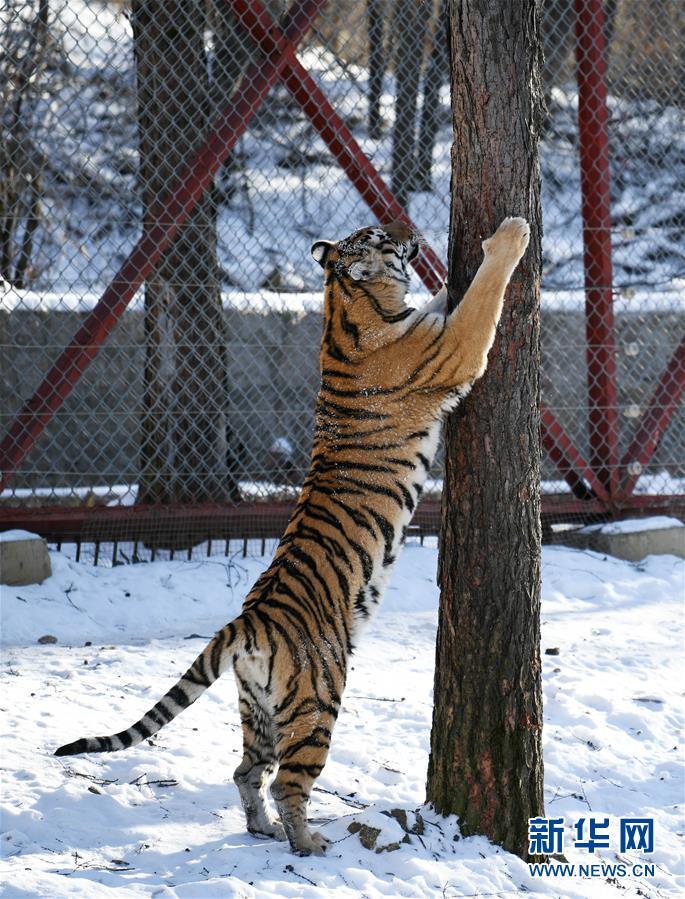 在橫道河子?xùn)|北虎林園散放區(qū),一只東北虎在練“爪子”(11月21日攝)。新華社記者王建威攝