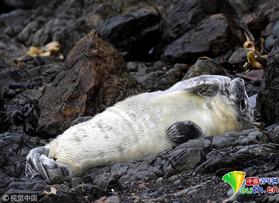 中國(guó)青年網(wǎng)北京10月9日電 當(dāng)?shù)貢r(shí)間2018年10月8日,英國(guó)彭布羅克郡,一只大西洋海豹幼崽躺在海邊礁石上。海豹幼崽出生時(shí)都有毛茸茸的白色非防水皮毛,它們會(huì)在第四周蛻皮。