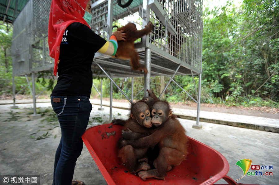 印尼加里曼丹克塔邦,國(guó)際動(dòng)物救援(IAR)猩猩安全與保護(hù)中心里,飼養(yǎng)員用獨(dú)輪車把猩猩寶寶送到森林學(xué)校。圖片作者:Newscom