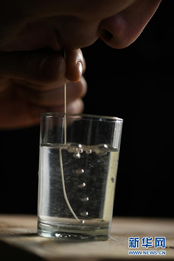 11月23日,在石家莊市藁城區(qū)耿家莊村某宮面生產(chǎn)廠,工人演示用空心的藁城宮面吹水泡。