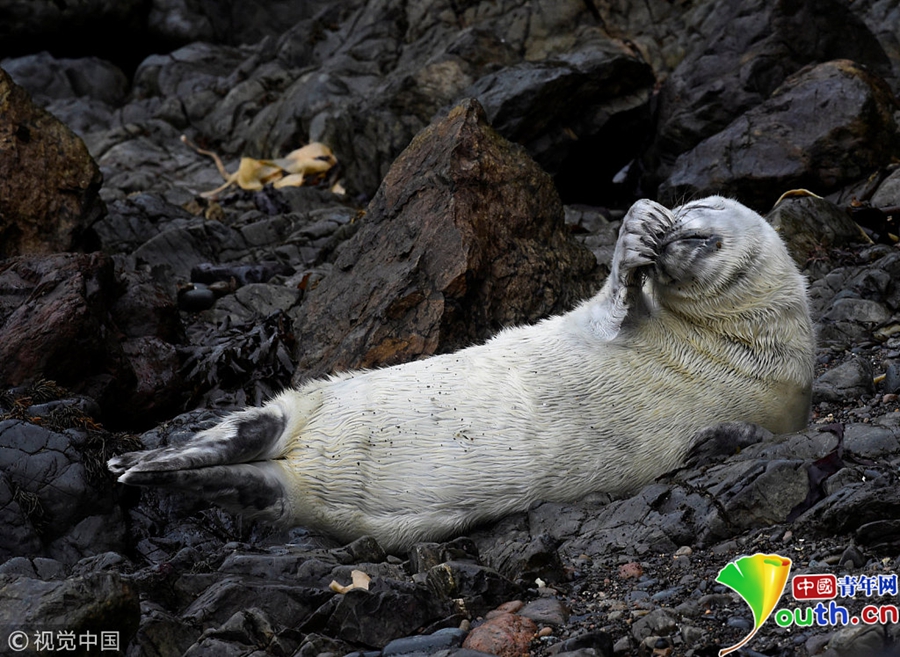 一只大西洋海豹幼崽躺在海邊礁石上,鏡頭前害羞遮臉。