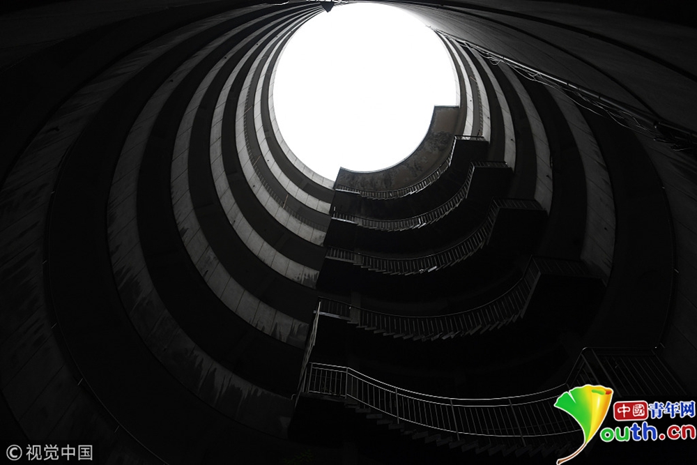 2017年9月27日,重慶,南岸區某小區的“螺旋”停車場,從公路到車庫要下5層樓,司機需要轉無數個360度圈。圖片來源:視覺中國