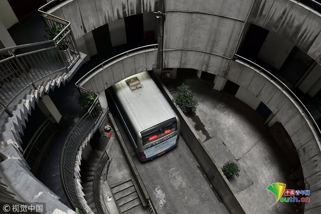 2018年12月6日,重慶江北紅旗河溝汽車站內,有一棟獨特的八層圓環狀建筑,底層每天有不少進出站的客車通行。圖為公交車穿過8層空心圓筒樓。