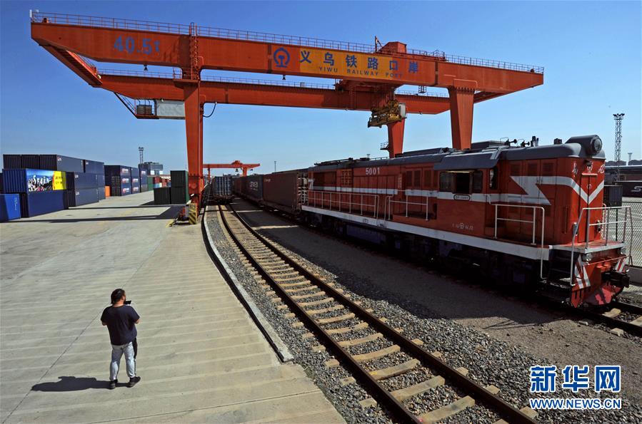 在浙江義烏鐵路西站,一列駛往西班牙馬德里的中歐班列(義烏)緩緩發車(10月27日攝)。 新華社記者 譚進 攝