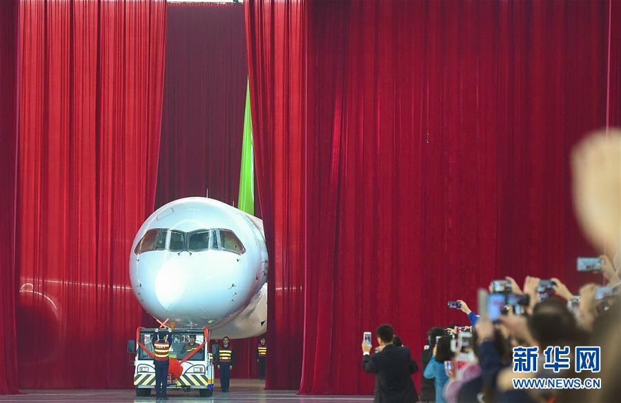 我國自主研制的C919大型客機首架機,在中國商飛公司總裝制造中心浦東基地廠房內正式下線(2015年11月2日攝)。新華社發(裴鑫攝)