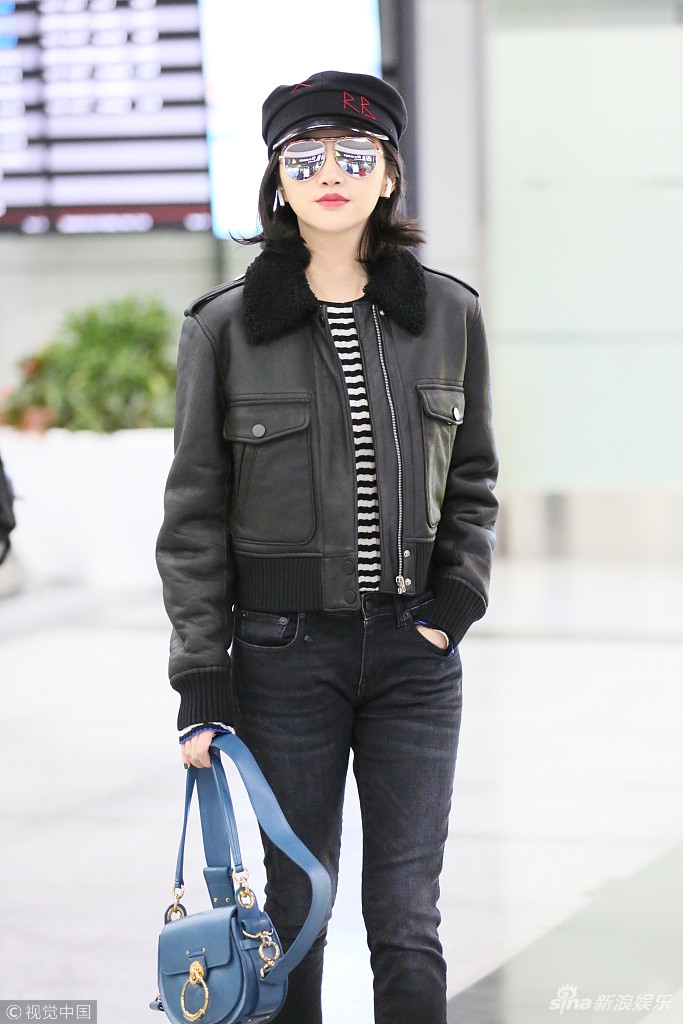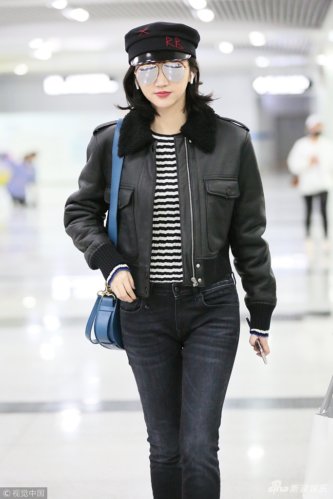 日前,景甜現身機場,身穿黑色皮夾克超有范兒,戴小帽酷似甜美女軍官。視覺中國/圖
