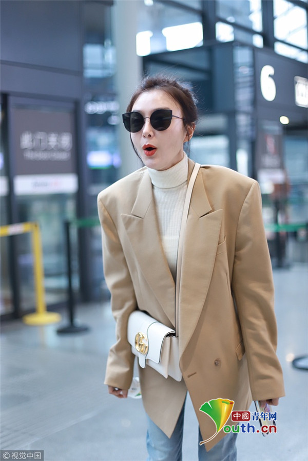 11月29日,上海,秦嵐現身機場。她戴白色鴨舌帽,穿白色星星圖案外套配微喇牛仔褲,架黑超涂紅唇笑靨如花。