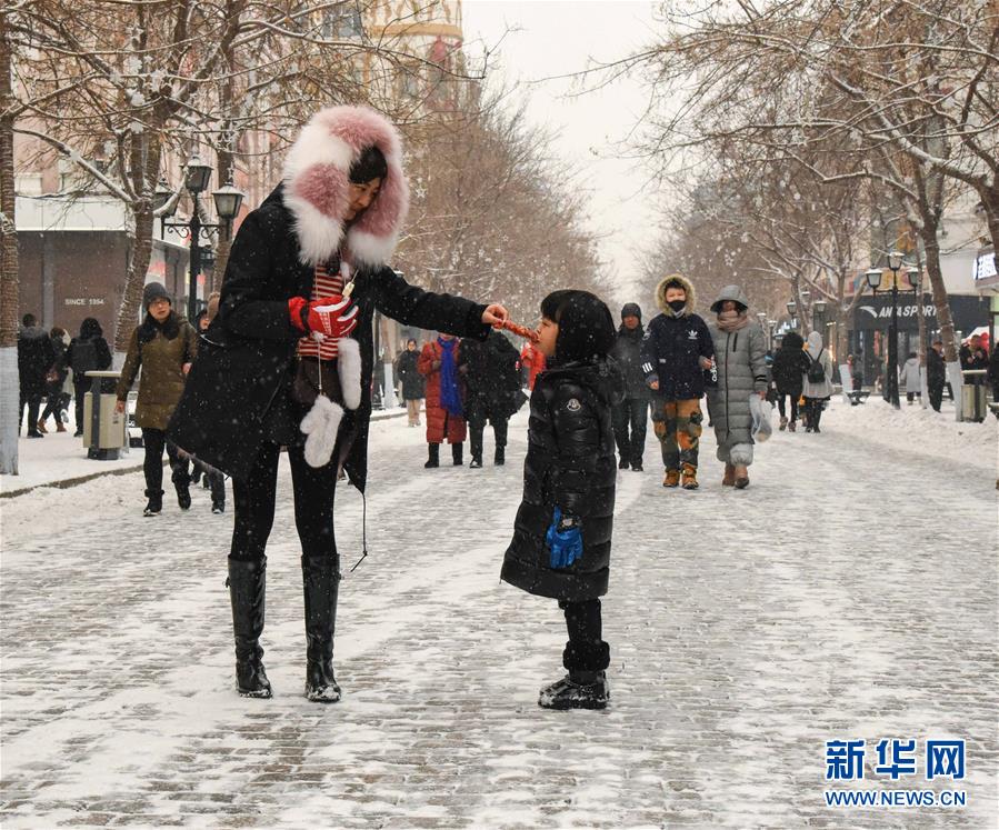 12月21日,游客在哈爾濱中央大街玩耍。當日,“冰城”哈爾濱迎來降雪天氣,整個城市變得銀裝素裹。新華社記者韓宇攝