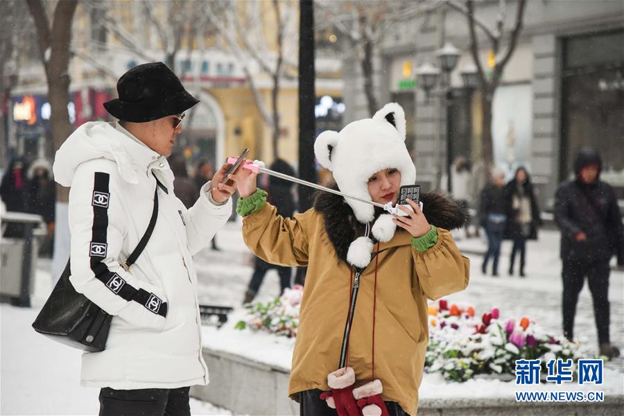 12月21日,游客在哈爾濱中央大街自拍。當日,“冰城”哈爾濱迎來降雪天氣,整個城市變得銀裝素裹。新華社記者韓宇攝