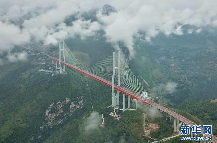 當(dāng)日,杭瑞高速貴州省畢節(jié)至都格(黔滇界)公路北盤江大橋上云霧繚繞,美景如畫。北盤江大橋主橋跨徑720米,橋面到谷底垂直高度565米。