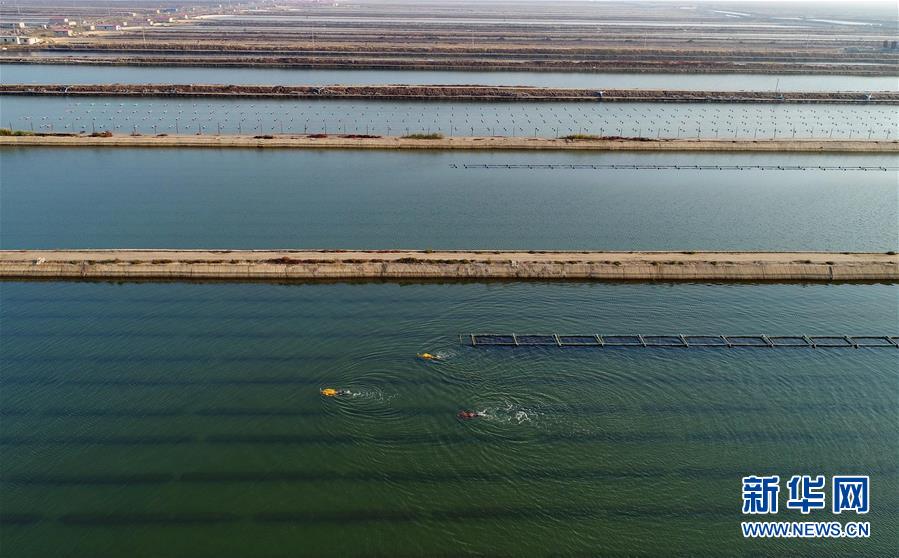 10月22日,樂亭縣姜各莊鎮二節村海參養殖基地的工人在捕撈海參(無人機拍攝)。 時下,正值渤海灣地區海參收獲時節,河北省樂亭縣的海參養殖戶忙著捕撈海參,供應各地市場。據介紹,該縣海域水質優良、氣候適宜,是海參養殖的理想場地,目前發展池塘造礁養殖海參面積6萬畝,年產鮮活海參6000多噸,年產值2億多元。  新華社記者 楊世堯 攝