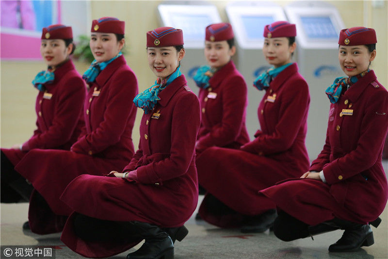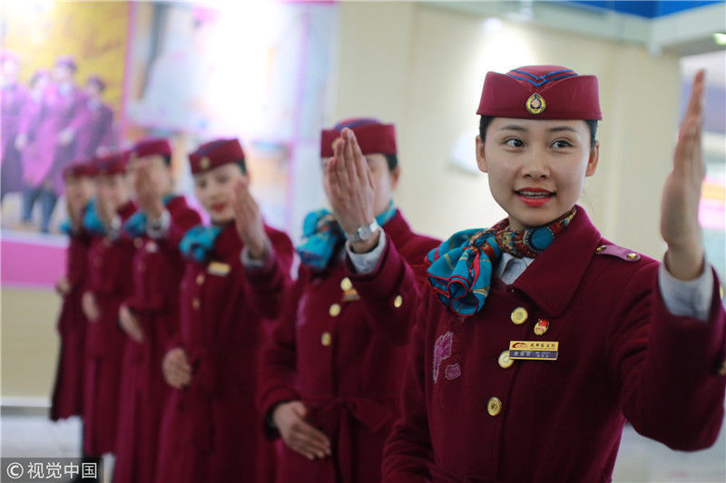 2018年12月27日,四川成都,為備戰(zhàn)即將開通的成雅鐵路,中國鐵路成都局集團(tuán)有限公司成都客運(yùn)段動車二隊(duì)對成雅動車的乘務(wù)人員進(jìn)行理論、形體、服務(wù)禮儀等內(nèi)容的培訓(xùn)。蘇志剛/視覺中國