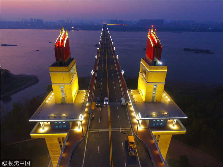 2016年10月28日晚,服役48年的南京長江大橋正式封閉,進入合同工期長達27個月的改造提升期。身為我國橋梁建設領域的扛鼎之作,南京長江大橋的此次封閉改造牽涉到公路繁忙、鐵路風險、技術攻關、文物保護等諸多難點,不僅影響面廣,而且社會關注度極高。如今,隨著整個工程進入收尾階段,即將于2018年12月底正式通車。圖為2018年12月13日,夜幕降臨,南京長江大橋歸位后的玉蘭花燈重新點亮。大橋玉蘭花燈柱共有299根,每根燈柱上有5盞玉蘭花燈,1大4小,一共1495盞。