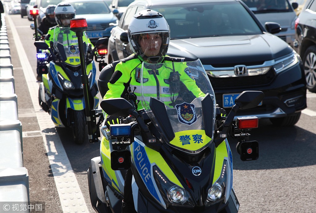 “江北新區分局交警支隊大橋特勤隊”的騎警隊員身著靚麗的熒光綠制服,騎行在南京長江大橋上巡邏。