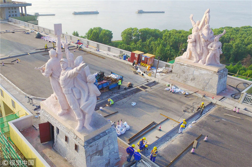 2018年6月24日,南京長江大橋修葺一新的淡粉色的工農兵雕像。