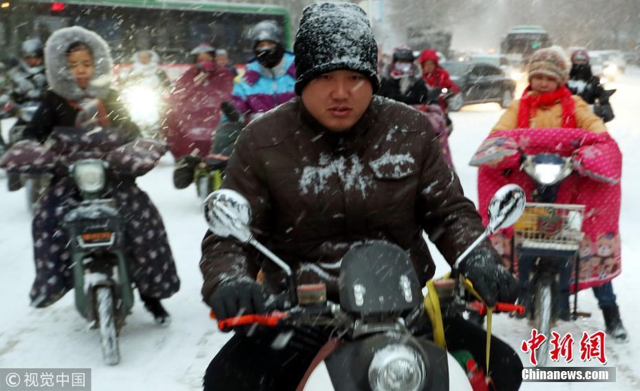河北石家莊井陘縣縣城,人們在雪中出行。受多股冷空氣的持續影響石家莊出現降雪、降溫天氣。圖片來源:視覺中國