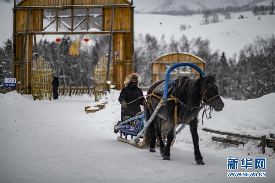 1月1日,在新疆禾木雪鄉,一名當地居民駕駛馬拉爬犁。