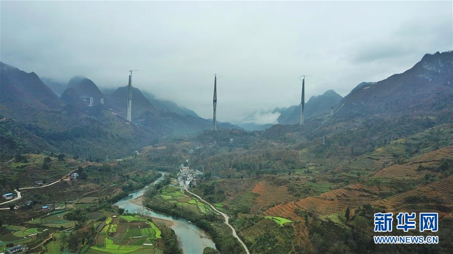 1月7日無人機航拍的平塘特大橋橋塔全景,中為高332米的世界第一高混凝土橋塔。