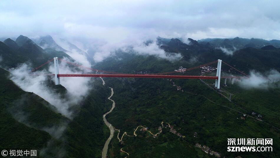 當日,杭瑞高速貴州省畢節至都格(黔滇界)公路北盤江大橋上云霧繚繞,美景如畫。北盤江大橋主橋跨徑720米,橋面到谷底垂直高度565米。