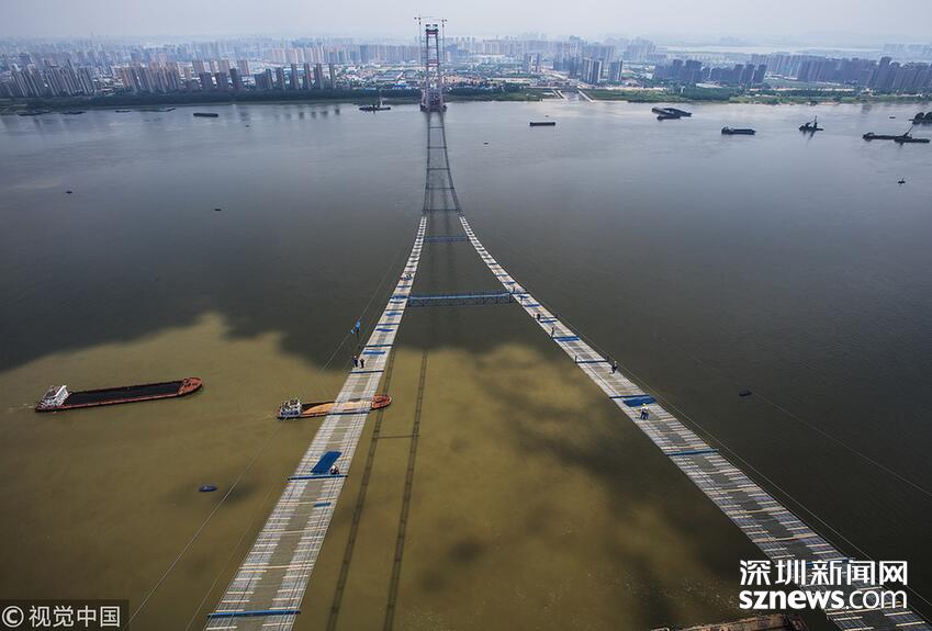 2018年5月14日,武漢,武漢楊泗港長江大橋上空,上部結構施工進入貓道面網鋪設階段,數十名中鐵大橋局工人在跨江高空拼搏趕超,江面上空的臨時“吊橋”悄然形成。數十名工人在長江上空228米處拼搏趕超,臨時“天梯”悄然形成。