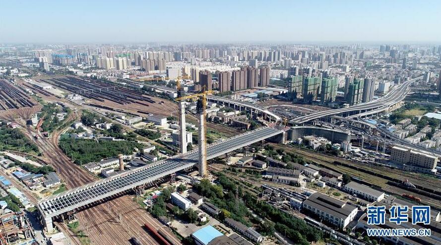 9月7日無人機拍攝的鄭北大橋鋼梁頂推施工現場。當日,跨越鄭州北站的鄭北大橋鋼梁頂推成功。鄭北大橋是東西走向的鄭州市農業路快速通道工程的一部分,需跨越鄭州北站。由于列車不能中斷運行,鄭北大橋不能采用常見的搭腳手架方式施工,而是采用頂推法,即在大橋一端把橋身拼接好,然后一段一段朝著鐵路編組站上方送過去,最終完成橋梁架設。新華社記者朱祥攝