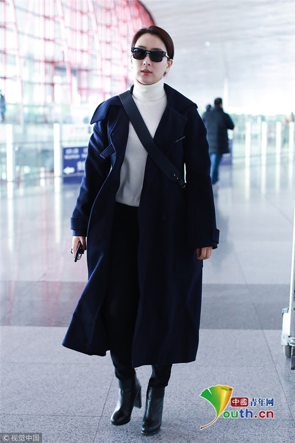 2019年1月7日,北京,馬蘇現身機場。她身穿黑色到腳大衣霸氣外露,架黑超涂紅唇似帥氣“女特工”。