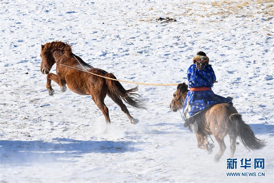 1月8日,牧民進行套馬表演。 時下正值草原冬季旅游旺季,內蒙古自治區西烏珠穆沁旗的牧民們在雪原上一展身手,為游客展現獨特的民族風情。 新華社記者 劉磊 攝