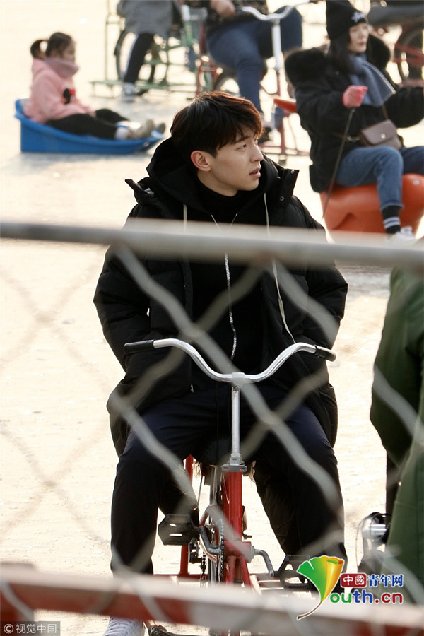 2019年1月9日,北京,鄧倫、馬思純現身后海滑冰場,騎冰車拍攝新劇《加油你是最棒的》。寒冷的北京,二人身著單薄的劇中服裝現身拍攝片場,不顧嚴寒超敬業。