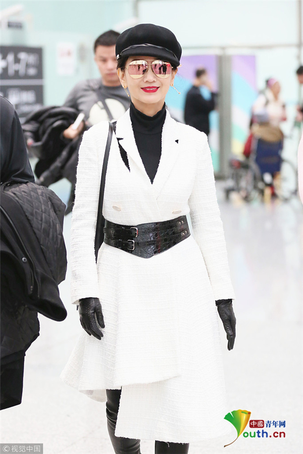 1月10日,廣東省深圳市,趙雅芝夫婦現身深圳寶安機場,頭戴貝雷帽的她架著反光墨鏡,一襲白色不規則連衣裙配上黑色腰封及皮靴,酷似甜美女教官!