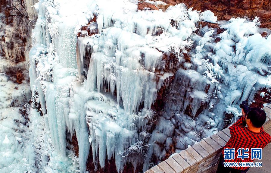近日,河北省涉縣太行五指山景區出現冰瀑景觀,吸引眾多游客到此觀賞。