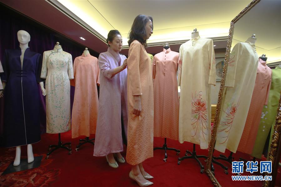 1月12日,在北京“碧泓云想”服裝設(shè)計(jì)工作室,高定服裝設(shè)計(jì)師畢紅(左)與顧客交流中式服裝款式的設(shè)計(jì)細(xì)節(jié)。畢紅設(shè)計(jì)的中式服裝以棉、麻、真絲等面料為主。春節(jié)來臨,其團(tuán)隊(duì)加班加點(diǎn)為顧客趕制中式服裝。