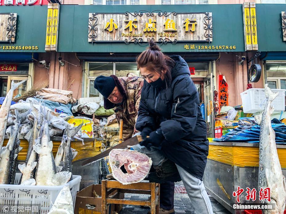 寒冬臘月是黑龍江撫遠的凍魚銷售旺季。讓人大開眼界的是,一二百斤大魚得鋸開了賣;最讓魚販子開心的是,最多一天進賬5萬元。魚販子半開玩笑地說:不是說數錢數到手抽筋嗎?進錢最多的一天,還真差不多。圖為1月12日,黑龍江省佳木斯市撫遠東極魚市,商戶在用鋸截斷凍魚。棋簿紫 攝 圖片來源:視覺中國
